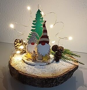 Die Wichtel kommen! Wir bemalen kleine Holzwichtel und dekorieren sie mit Schnee, Glitzer und Naturmaterialien auf einer Holzscheibe. Beleuchtet mit einer LED-Lichterkette kann Weihnachten kommen!