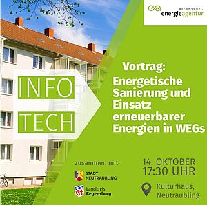 Viele Eigentümerinnen und -eigentümer in Wohnungseigentümergemeinschaften (WEGs) treibt die Frage um, wie ihr Gebäude energetisch optimiert und modernisiert werden kann. Während einige Maßnahmen privat umgesetzt werden können, müssen Maßnahmen in der zentralen Energieversorgung sowie energetische Sanierungsmaßnahmen gemeinsam mit allen Parteien beschlossen werden. Bei der Informationsveranstaltung informiert die Energieagentur Regensburg über die verschiedenen Heizsysteme im Bereich der erneuerbaren Energien sowie Maßnahmen und Förderungen in der energetischen Wohngebäudesanierung. Darüber hinaus wird auch der Einsatz von Photovoltaik und das Thema Mieterstrom im Rahmen von WEGs beleuchtet. Die Veranstaltung findet in Kooperation mit der Stadt Neutraubling und dem Landkreis Regensburg statt.